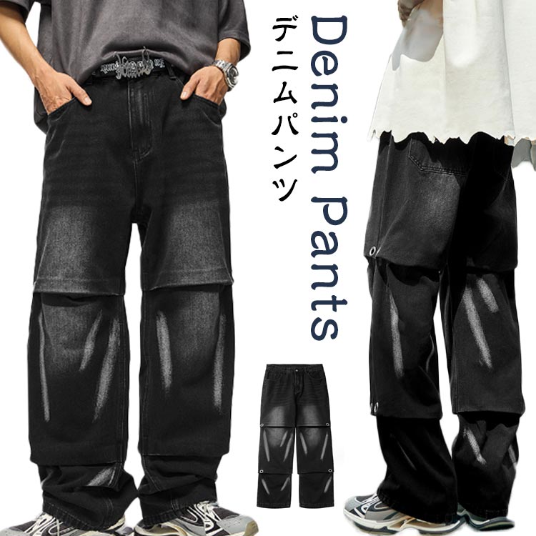 デニム パンツ デニムパンツ ストレートパンツ ウォッシュ加工 ジーンズ ワイドパンツ ロング 秋 ワイド ジーンズ デニムパンツ メンズ ゆったり ストレート 不規則デザイン ストレート イージーパ