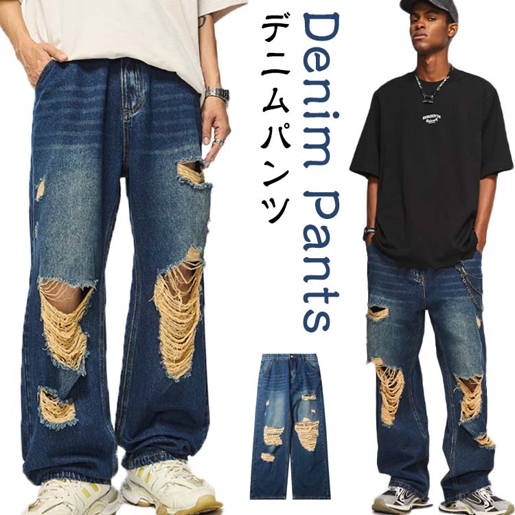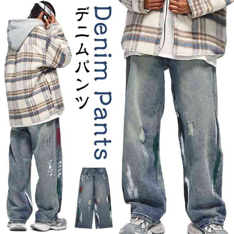 パンツ デニムパンツ ワイドパンツ ストレートパンツ ロング ストレート ダメージ加工 デニム ジーンズ デニムパンツ メンズ デニム ワイド ペンキ加工 ストレート ジーンズ ウォッシュ ゆったり