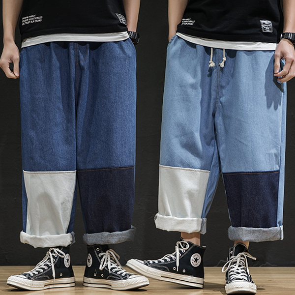 今年らしいワイドパンツ メンズ デニム ワイド ゆるパンツ パッチワーク風 ガウチョパンツ デニム パンツ ワイドデニム