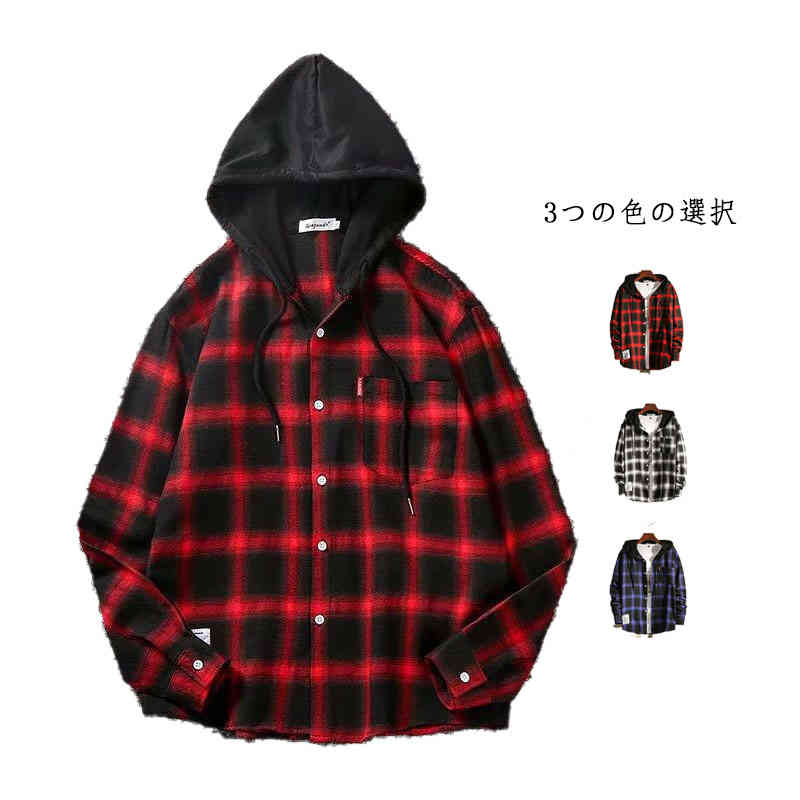 シャツ メンズ 春秋 フード付きシャツ カジュアルシャツ 長袖 春 秋 羽織り フード付きパーカー 前開き トップス チェック柄