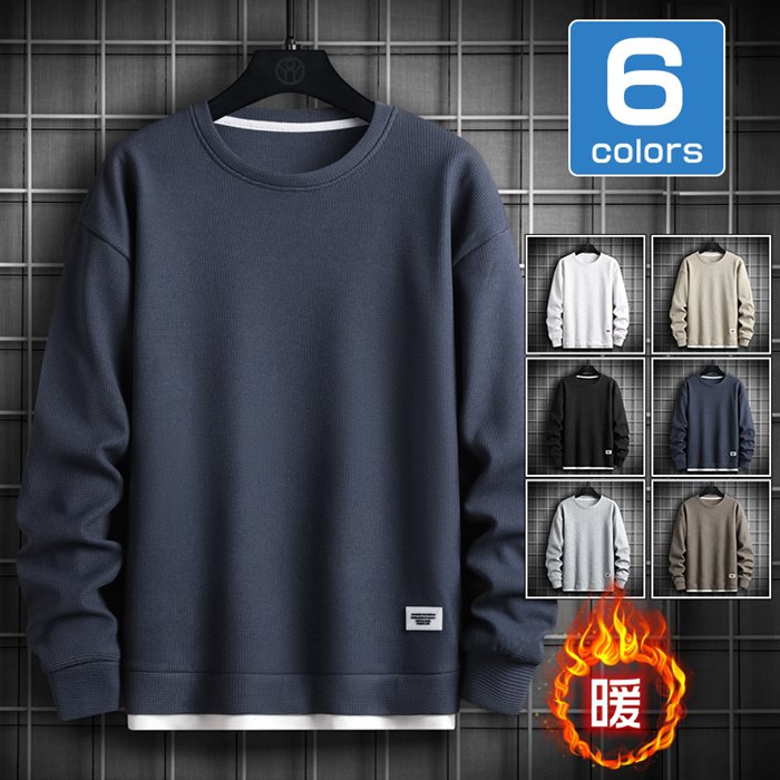 トレーナー スウェット メンズ トップス 裏起毛 ワッフル 防寒 暖かい 重ね着風 ワッフル編み クルーネック 長袖 無地 おしゃれ ゆったり スポーツ 着回し 韓国ファッション 冬