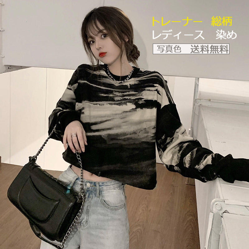 トレーナー レディース 染め ショート丈 へそ出し スウェット プルオーバー ゆったり 総柄 着痩せ 長袖 パーカー トップス アウター 秋 おしゃれ きれいめ 大きいサイズ 部屋着 ルームウェア カ