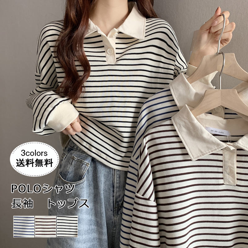 POLOシャツ 長袖 ショート丈 レディース トップス ストライプ トレーナー ゆったり パーカー カジュアル 着痩せ ファッション シンプル 大きめ ショート おしゃれ フリーサイズ 秋 韓国風 秋
