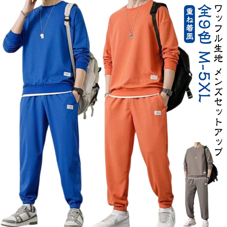 メンズ セットアップ レイヤード風 ワッフル生地 長袖 トレーナー スウェット ロングパンツ 2点セット 秋 冬 秋冬 春服 秋服 男性 20代 30代 40代 男