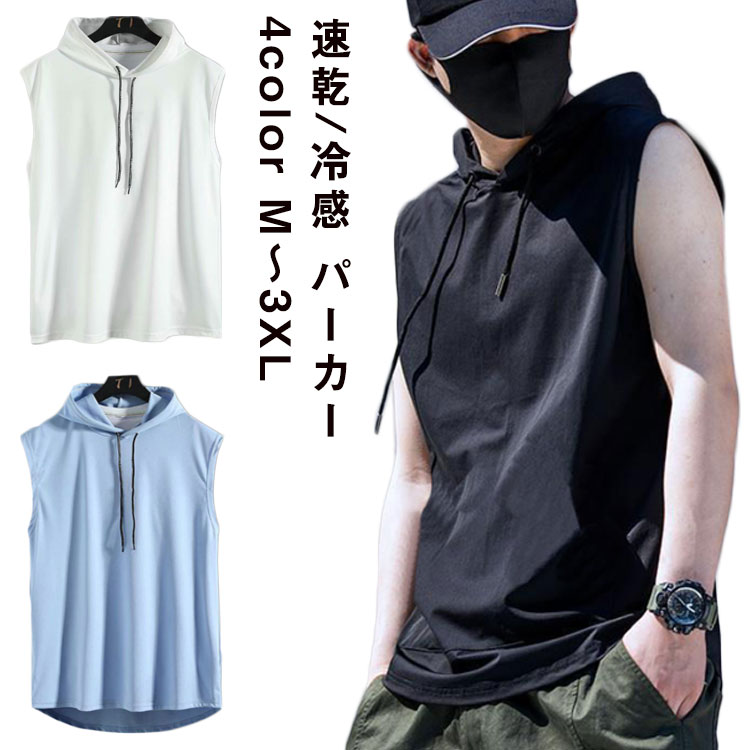 袖なしパーカー 冷感メンズパーカー ストレッチ 夏物 プルオーバーメンズファッション トップス パーカー