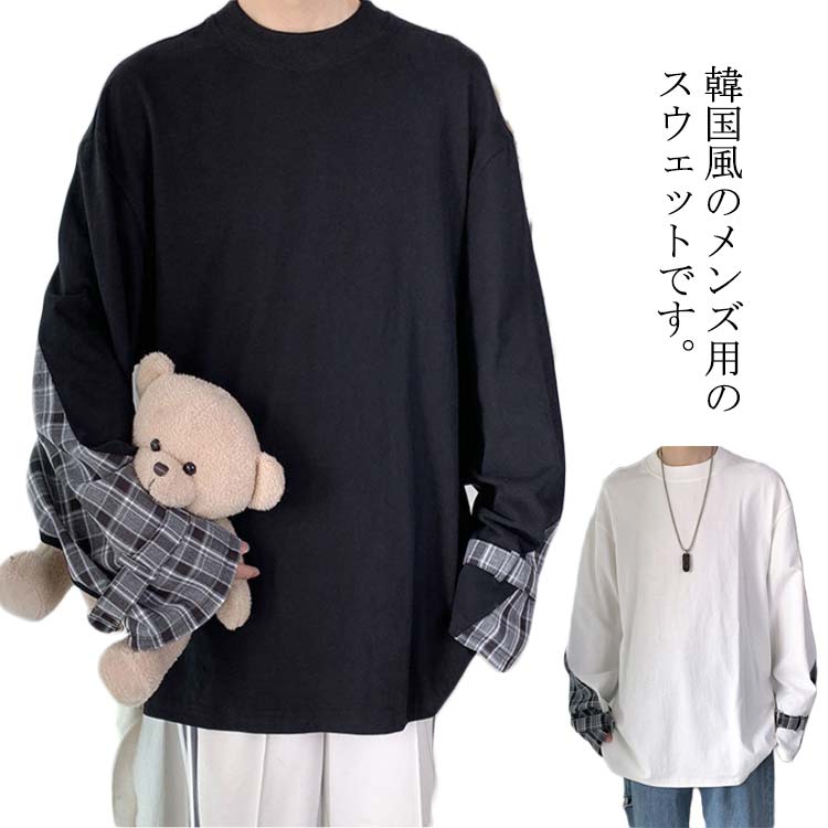 韓風 メンズ スウェット 長袖 ロング 春秋 レイヤード風 おしゃれ トップス 異素材 ゆったり パーカー トップス 薄手 オーバーサイズ