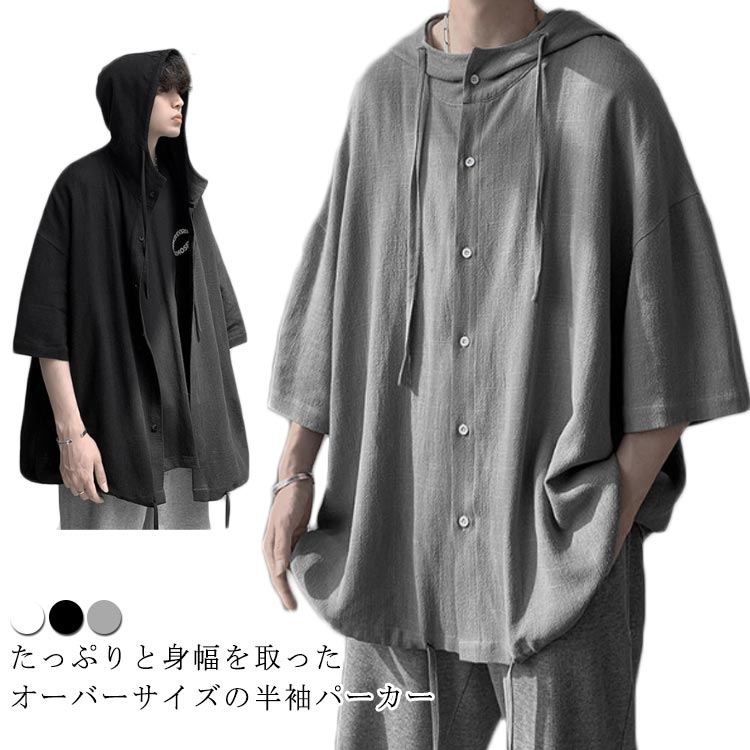 無地 ビッグシルエット 春夏 パーカー 前開き 薄手 大きいサイズ 半袖パーカー メンズファッション フード付き 部屋着 韓国 シンプル カッコイイ 5分袖 ギフト メンズ オーバーサイズ 大きいサイ