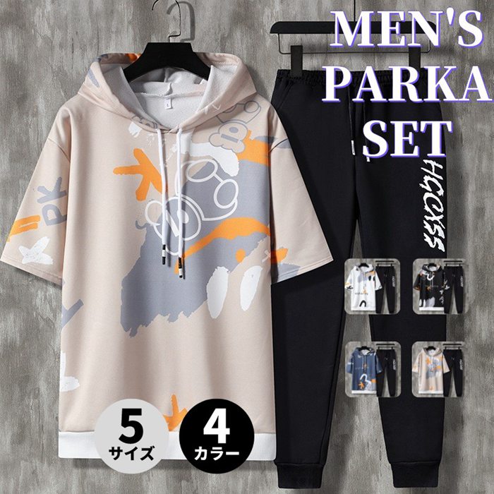 セットアップ パーカー 上下セット トップス ボトムス 半袖 メンズ ジャージ フード付き スウェット ロングパンツ 韓国 ファッション おしゃれ ゆったり 部屋着