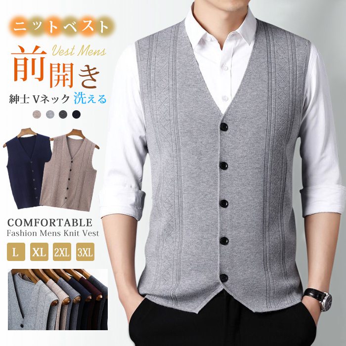 ニットベスト メンズ Vネック 秋 冬 ウール 前開き 紳士 ジレ メンズ ビジネスベスト 無地 シングルボタン チョッキ 洗える 通勤 お洒落 アウター 細身 V首 メンズ ニットベスト