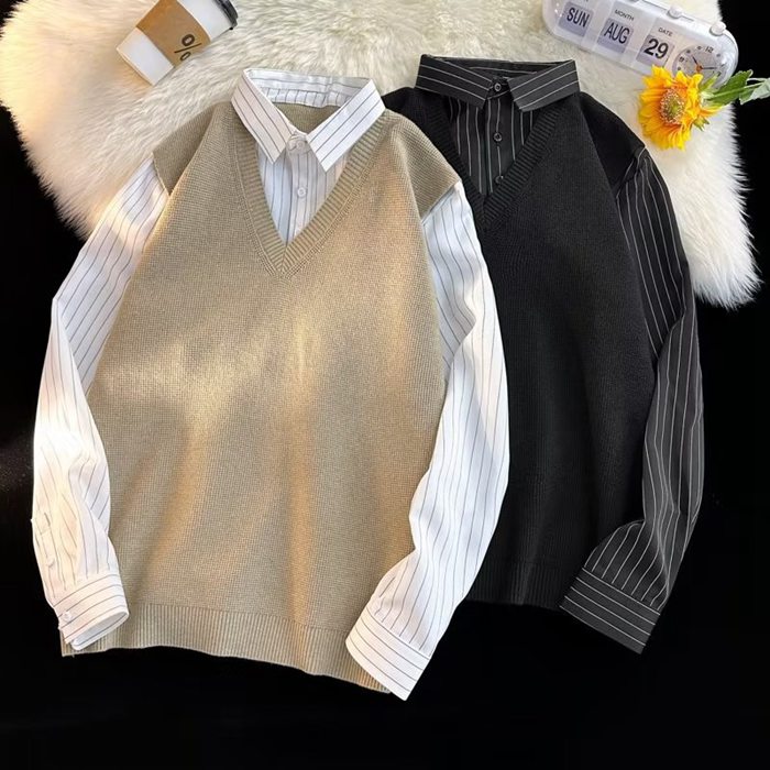 ニットベスト シャツ 重ね着風 Vネック フェイクレイヤード 長袖 メンズ 切り替え ストライプ ワイシャツ 秋冬 カットソー スリム