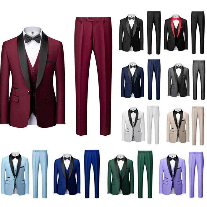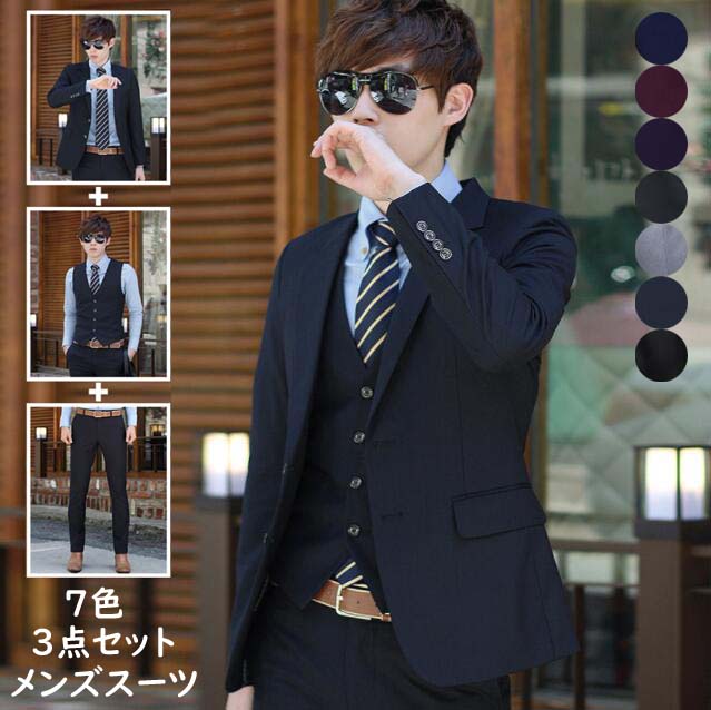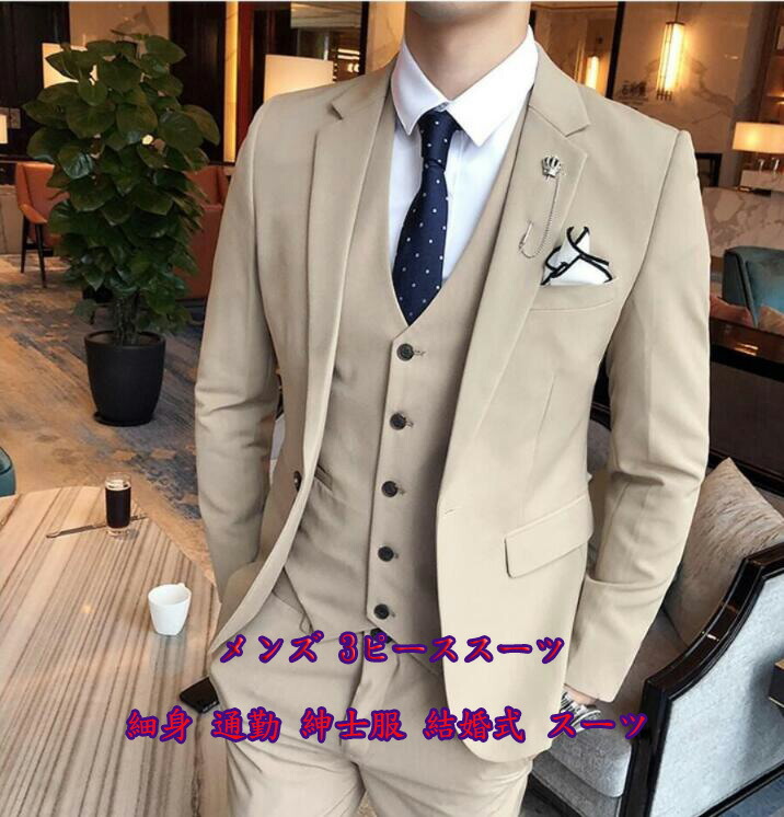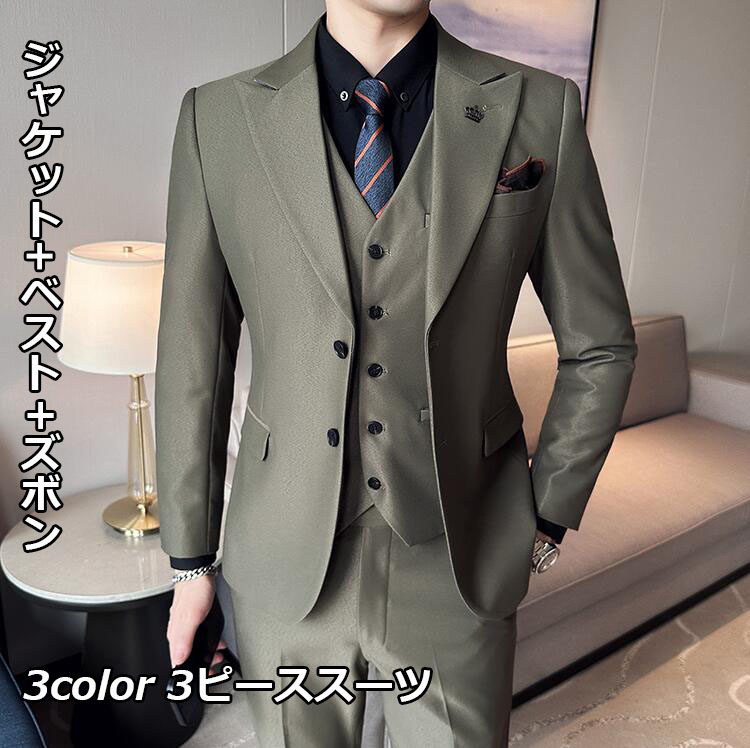 開催中 メンズファッション 3色 メンズスーツ 無地 3点セット ジャケット+ベスト+ズボン 3ピーススーツ ビジネススーツ M~3 2つボタンスーツ カジュアルスーツ ハイエンド