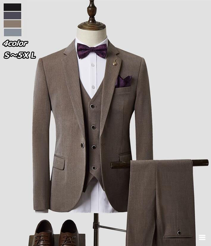 メンズファッション 2色 メンズスーツ 無地 3点セット ジャケット+ベスト+ズボン 3ピーススーツ ビジネススーツ 落ち着いたスーツ 大きいサイズ M~4 2つボタン カジュアルスーツ