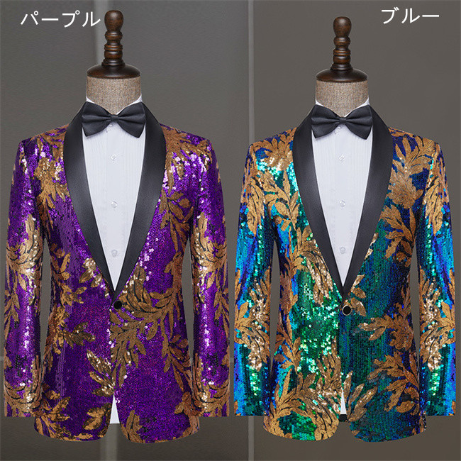 パープル ブルー ラメキラキラメンズスーツジャケットタキシードメンズ タキシード演出服 華麗な王族服 王子様 復古風 コスプレ衣装宮廷服貴族服コスチューム舞台撮影司会 アウター メンズ衣装トップス三角