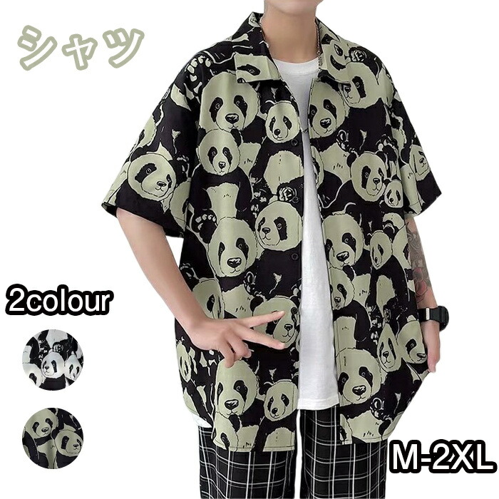 シャツ メンズ アロハシャツ 半袖 夏服 パンダ柄 プリント 開襟 総柄 カジュアル ゆったり ファッション M-2XL