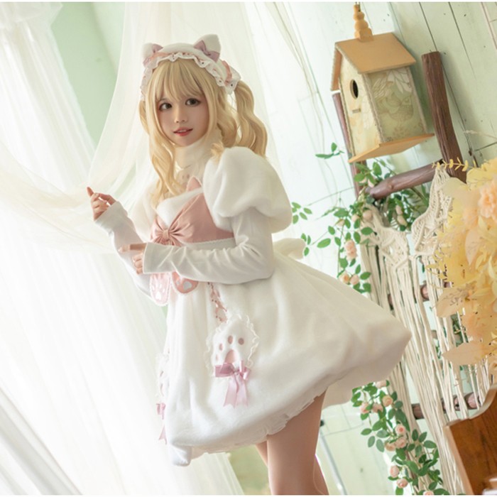 ロリィタ ワンピース 半袖 秋冬 あったか ボア 甘ロリ 肉球 ネコ 猫耳 リボン ゆめかわ もこもこ 姫系 防寒 冬 モコモコ 日系 ソフトガール