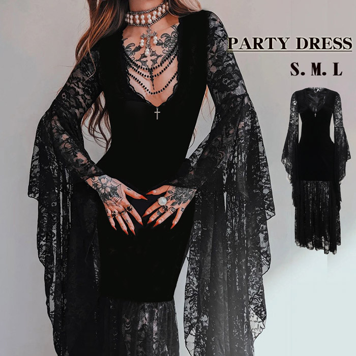 仮装舞踏会 女性用 パーティー ワンピース ゴシック風 ドルマンスリーブレースパッチワーク ベルベット舞台服 変装 仮装 ハロウィン衣装 イベント コスチューム 学園祭352005