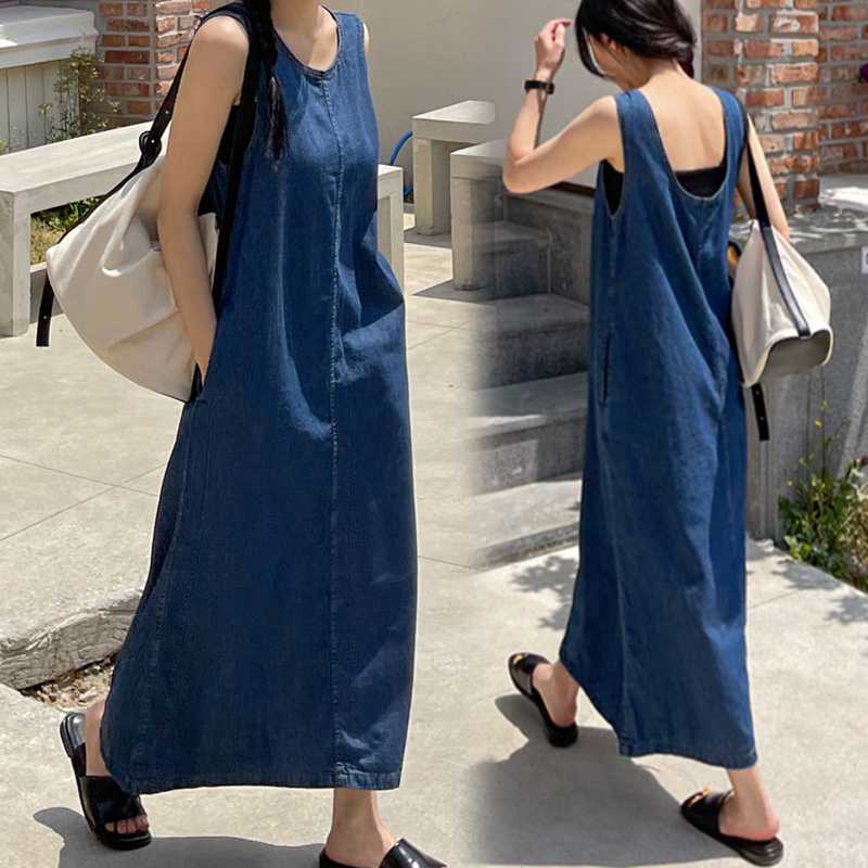 デニムワンピース ロングワンピース レディース 夏 ノースリーブ フレアワンピース Aライン マキシ丈ワンピース ジーンズ 無地 ゆったり 大きいサイズ 韓国ファッション スリム 着痩せ