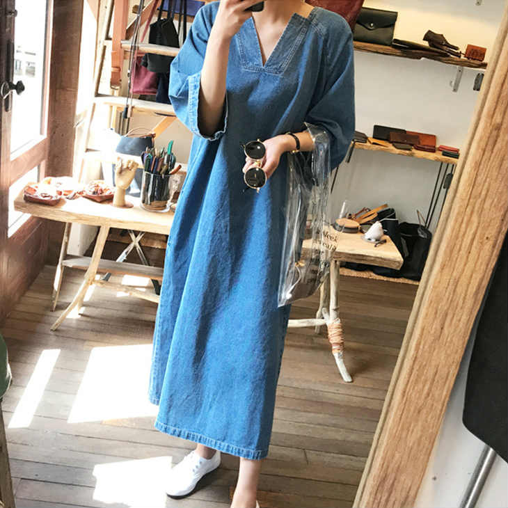 レディースデニムワンピースVネック長袖ミモレ丈膝下丈ロング丈スカートトップスカジュアルキュート大人可愛いフェミニンおしゃれ出かけデイリー