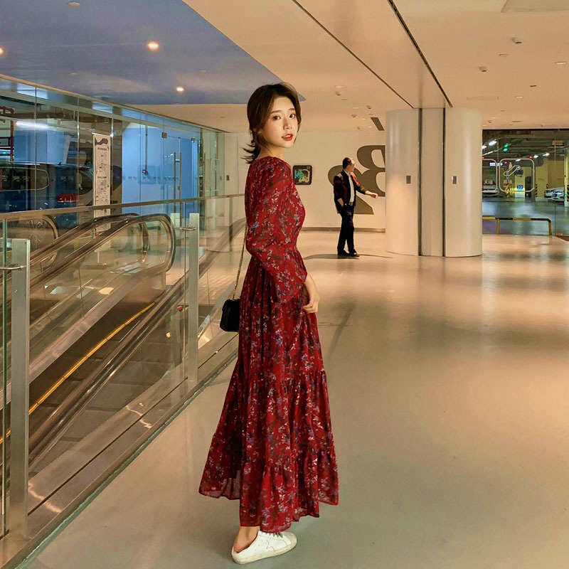 レディースワンピース長袖シフォンマキシ丈総柄小花柄レトロカジュアルエレガントキュート大人可愛いフェミニンオフィスお出かけデートデイリーレッド