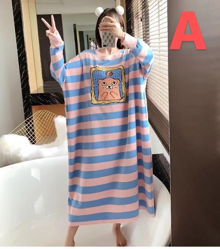 レディース ロングワンピース ルームウェア パジャマ 夏 ゆったり 丸首 長袖 ボーダー柄 可愛い 大きいサイズ 006