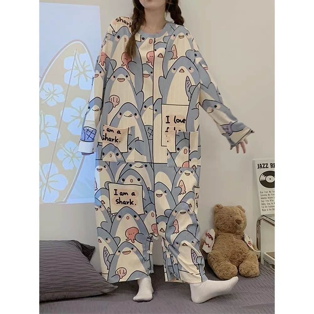 レディース ルームウェア パジャマ 春秋 ロング 長袖 連体服 ゆったり 可愛い 総柄 大きいサイズ 004