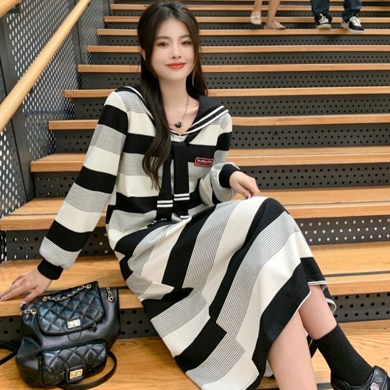レディース ロングワンピース 春秋 ボーダー柄 ゆったり 大きいサイズ 襟付き 可愛い 241