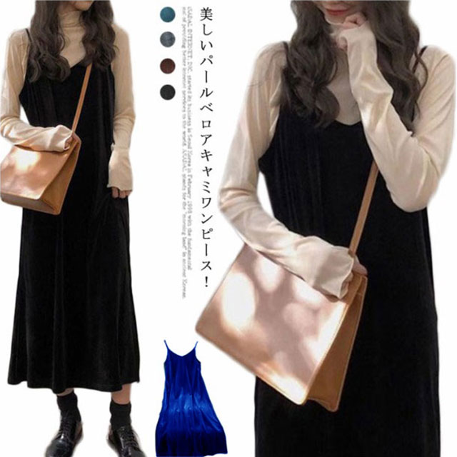 キャミワンピース パールベロア レディース キャミソール ミモレ丈 ロングワンピース 秋冬 無地 ゆったり Aライン おしゃれ きれいめ お出かけ