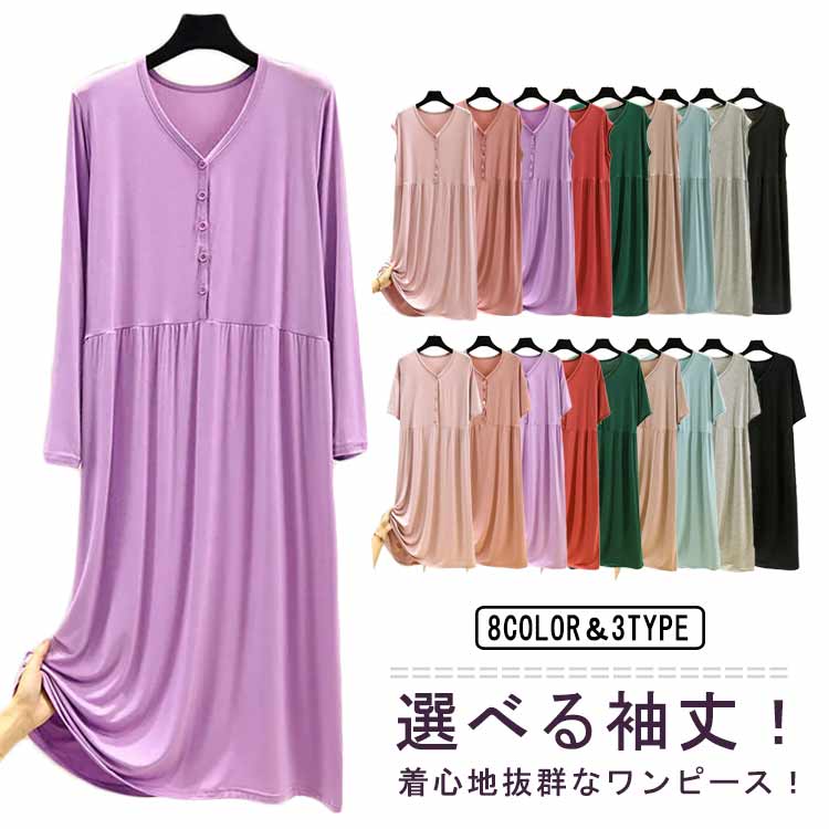 接触冷感 マタニティ ルームウェア ノースリーブ 長袖 春夏 部屋着 レディース 半袖 秋 ワンピース モダール ロング丈 前開き 授乳 妊婦パジャマ Vネック 無地 Tシャツワンピ 体型カバー ワン