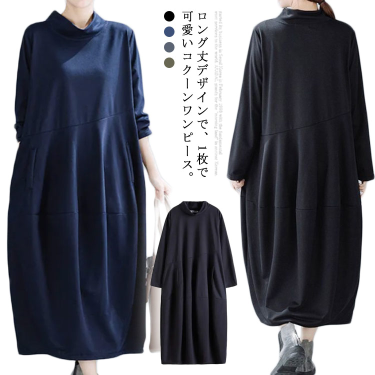 コクーンワンピース ボトルネック 秋服 長袖 レディース ロング丈ワンピース プルオーバー バルーン ワンピース 体型カバー ゆったり ポケット付き