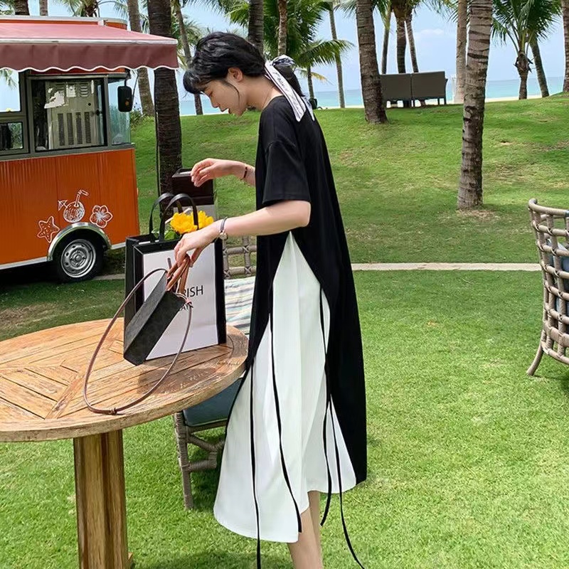 ワンピース レディース 重ね着風 夏 サロペット風 半袖 ロング Aラインレディースファッション ワンピース