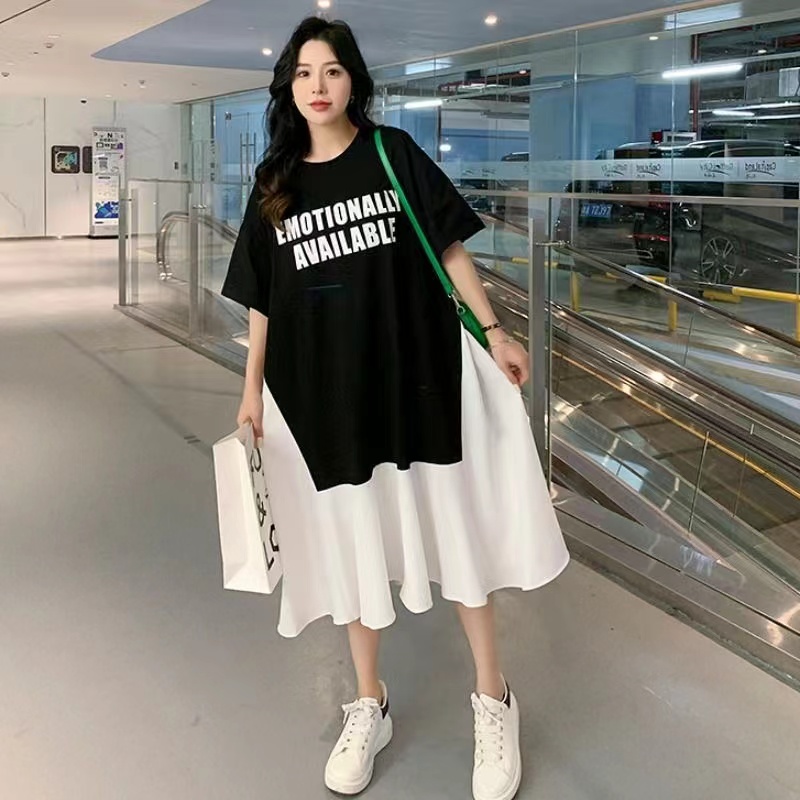 切り替えワンピース レディース フリル 半袖 大きいサイズ 英文字 バイカラーレディースファッション ワンピース