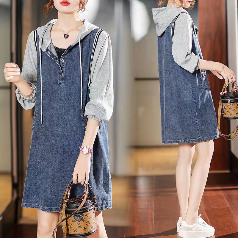 デニムワンピース ワンピス デニムワンピース ワンピ 大人 トップス 体型カバー フード付き ライン デニム切替スカート カジュアル 春秋 長袖 薄手 大きいサイズ ゆったり 2 3