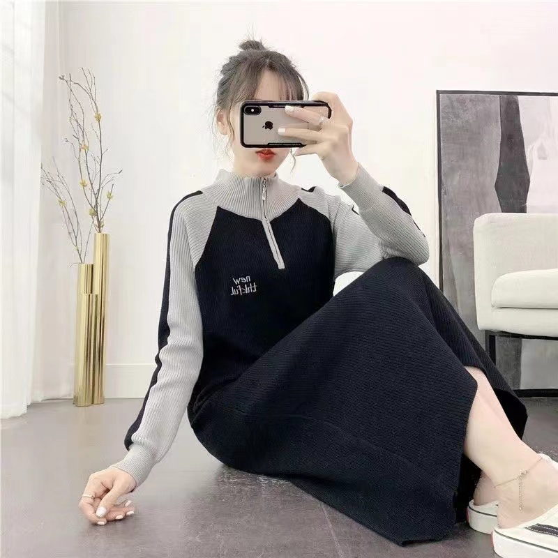 ニットワンピ ロングワンピース ワンピース 春 秋 冬 韓国風 レディース サイドライン 通勤 カジュアル ゆったり ひざ丈 膝丈 可愛い グレー ブラック 2 095