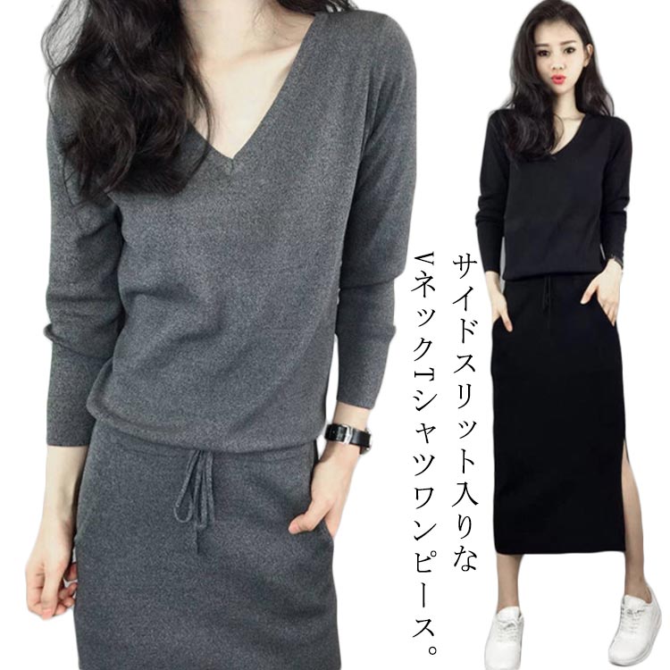 トレンド スリット入り スリム 着痩せ かわいい スリット入りレディースファッション ワンピース