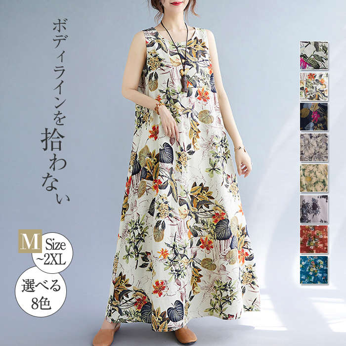 ワンピース 夏 レディース きれいめ 花柄 マキシワンピース ロングワンピースリゾートワンピース ノースリーブ クルーネック 総柄 体型カバー ビーチ サマードレス ロング マキシ丈 シンプル 大人