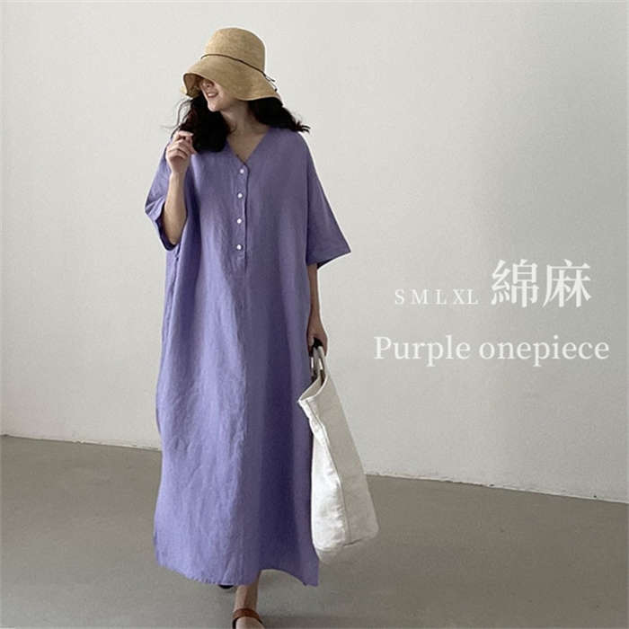 一枚でコーデ完成 リネンワンピース Dolman Dress 大きいサイズ 春夏 パープル ♪レディースファッション ワンピース