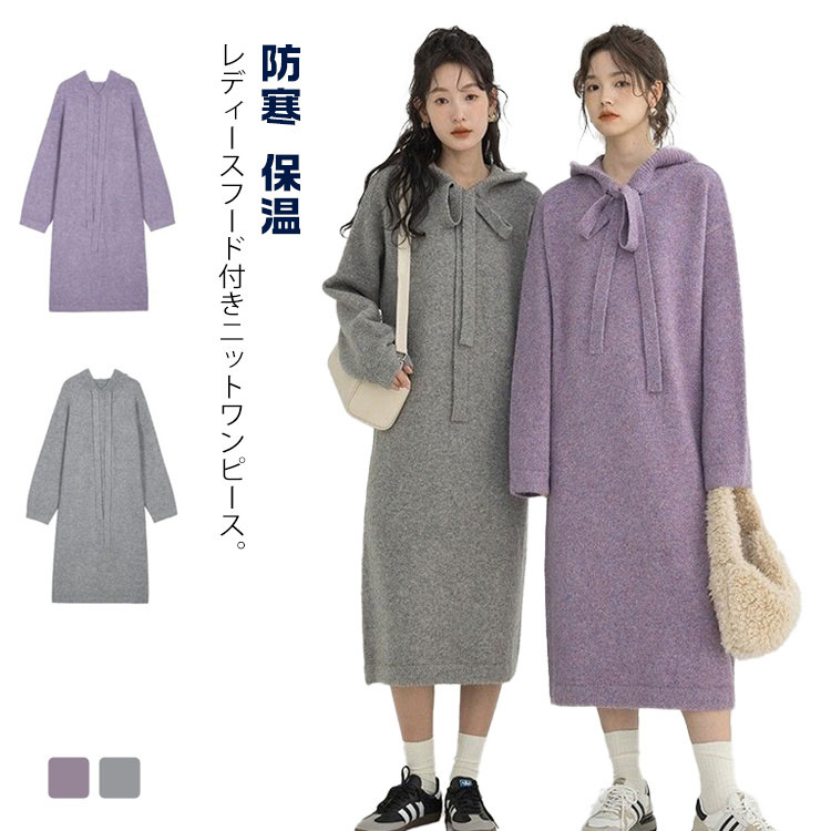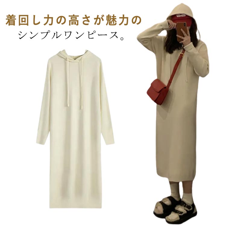 秋冬 ミモレ丈 ワンピース 大人 大人 ニットワンピース 無地 フード付き 帽子 リブニット ワンピース 長袖 ロング 20代30代40代 50代 ストレッチ