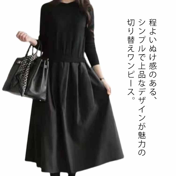 ニットワンピース プルオーバー 無地 切り替え ラウンドネック カジュアルワンピース ママ 母