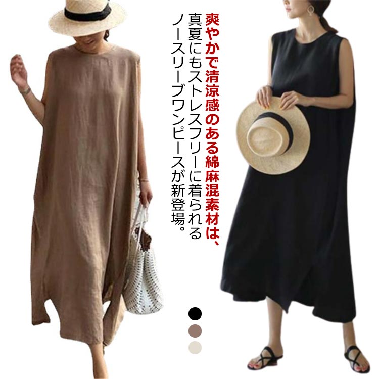 リネンワンピース 大きいサイズ リネンワンピース ワンピース ワンピ 無地 大人 大きめ ナチュラル レディーマキシワンピース ノースリーブ ナチュラル リネンワンピ