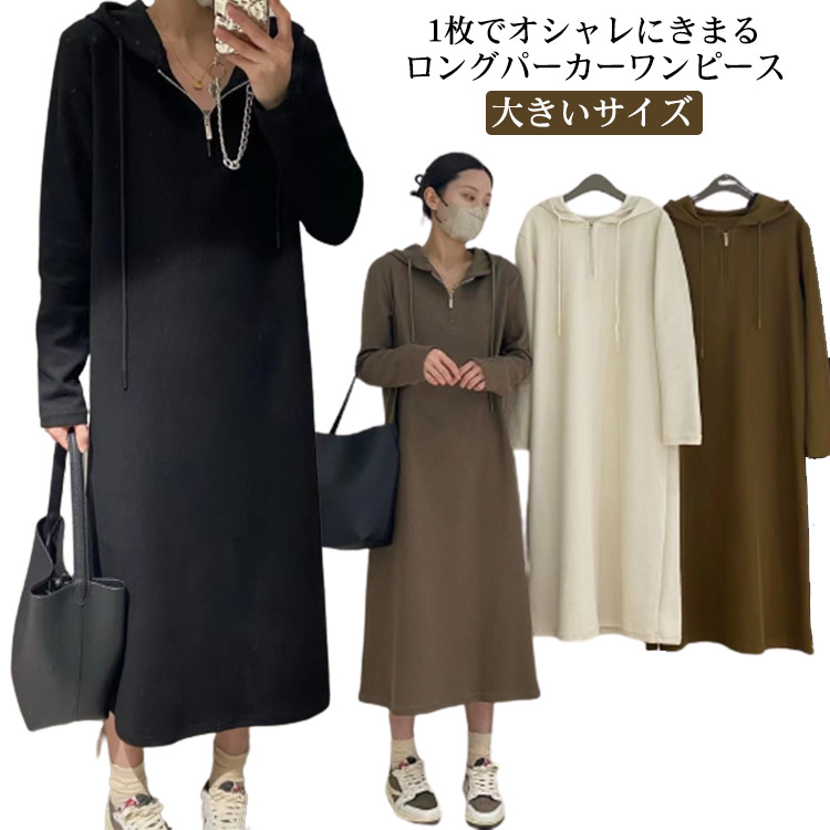 ミモレ丈 ハーフジップ パーカーワンピース フード付き シンプル 長袖 マキシワンピース マタニティウェア 大きいサイズ 春 秋 ロングワンピ 通勤 オフィス カジュアル ゆったり ロングワンピース