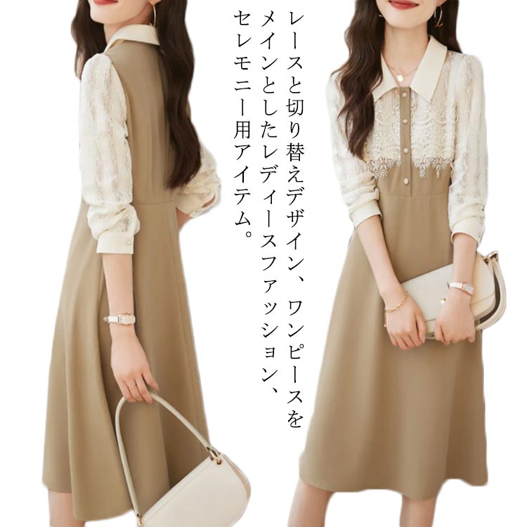 レディース 春 ワンピース 切り替え おしゃれ フォーマルワンピース スーツ ママ 結婚式 ロングワンピース 襟付き おしゃれ 上品 フェミニン レース