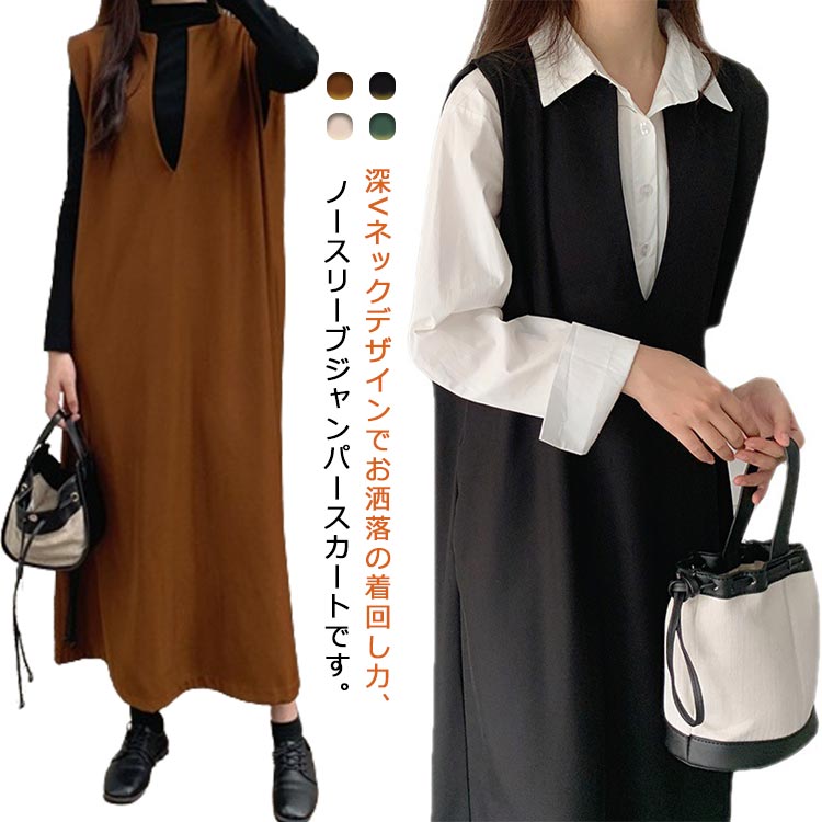 マキシ丈 ロング ジャンパースカート 秋 フォーマル きれいめ 深ネック ロングワンピース ワンピース