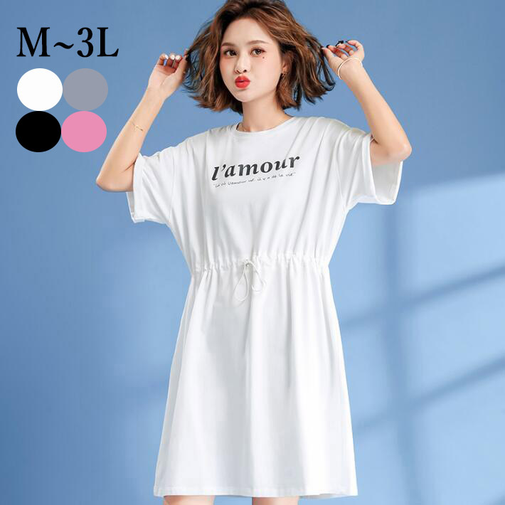 TシャツワンピースロングTシャツウエスト紐コットンオーバーサイズゆるTシャツチュニックロゴワンピースロゴT半袖ミニワンピース ルームウェア大きいサイズクルーネック夏ML 2L3L