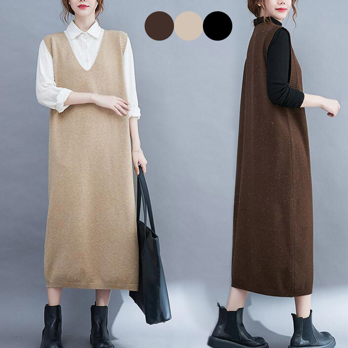 ベスト ニットベストベストワンピースキラキラ ノースリブワンピース ワンピース セーターVネックきれいめ ミディアムロングベスト おしゃれ 春秋