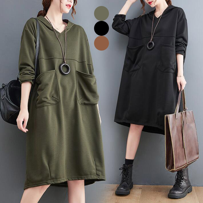 ロングワンピースワンピース シャツワンピースカットソー ワンピ長袖 フードミディアムロングオーバーサイズビッグシルエット大きいサイズポケット付き春秋 2