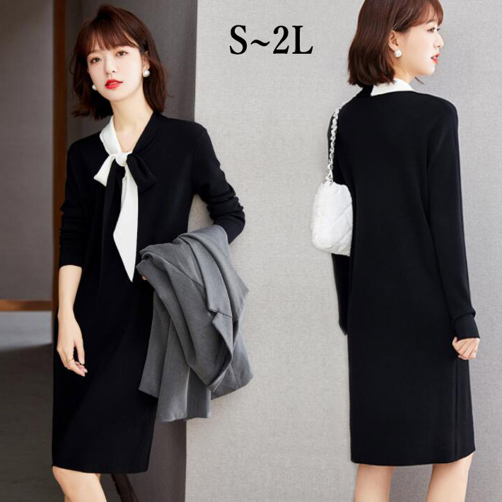 ワンピース レディース ニットワンピース 長袖 ボウタイミニ丈膝丈ワンピ切替ニットセーター チュニックロングニットクルーネック 切替ストレッチ 無地 春秋SML2L