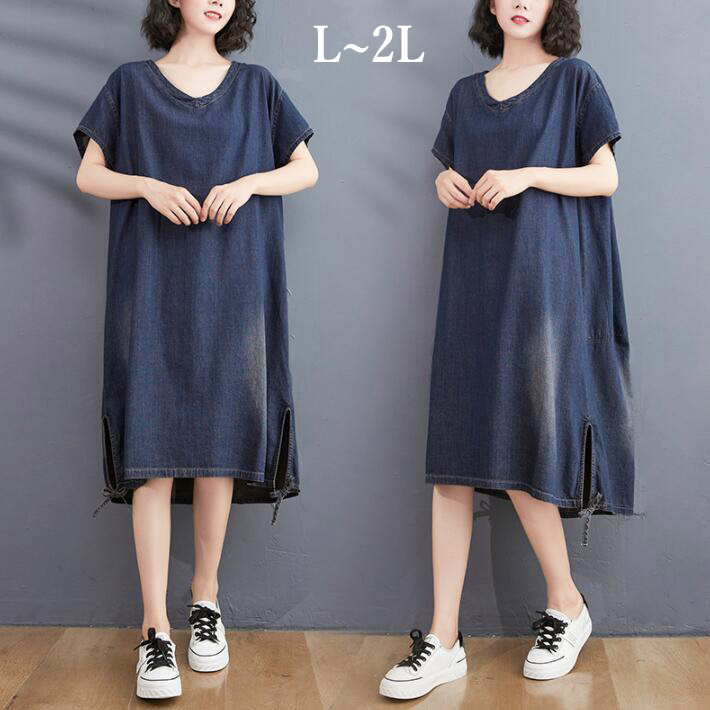 デニムワンピースロングワンピースレディース半袖大きいサイズスリットフレンチスリーブワンピデニムロングVネック体型カバー 夏L 2L