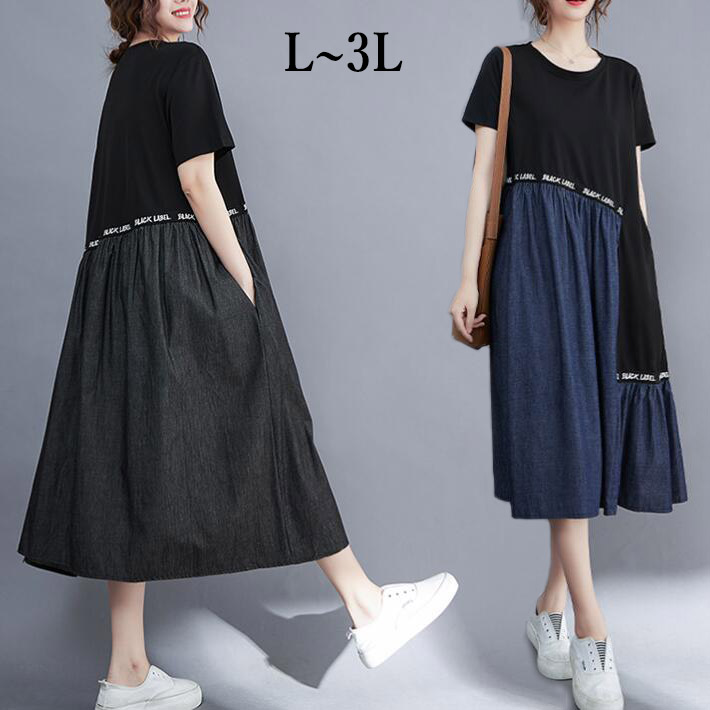 ワンピースロングワンピースデニム切替ポケット ギャザー英文字ゆったりAライン ひざ丈体型カバー 半袖 ロング レディース 大きいサイズきれいめ 夏L2L3L