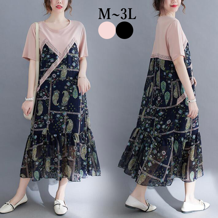 フラワーワンピースフリルワンピース花柄切替ワンピースギャザーワンピース ロング半袖着やせ大きいサイズ レディース オシャレ M L 2L3L