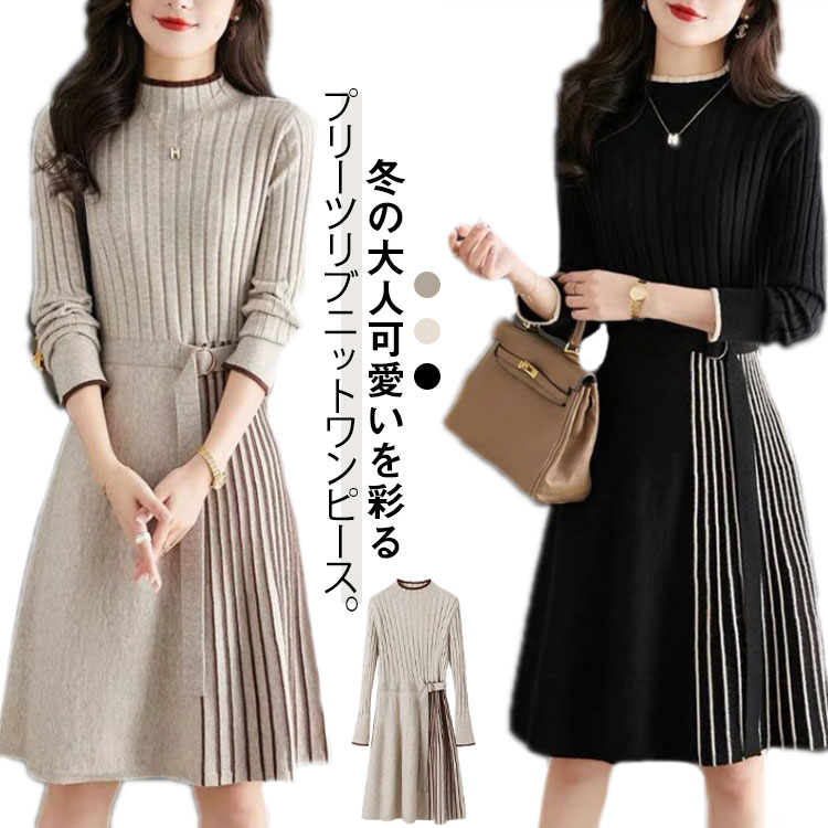 ニットワンピース レディース 秋 冬 きれいめ ワンピース プリーツ風 膝丈 ロングワンピース Aライン
